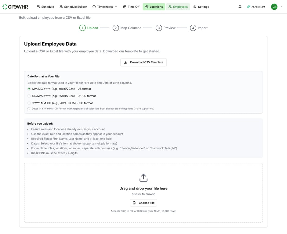 - Use the template: The downloadable template ensures your columns match what CrewHR expects