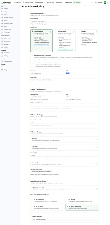 - Start simple: If you are new to CrewHR, start with the default policies and customize them as you learn your needs